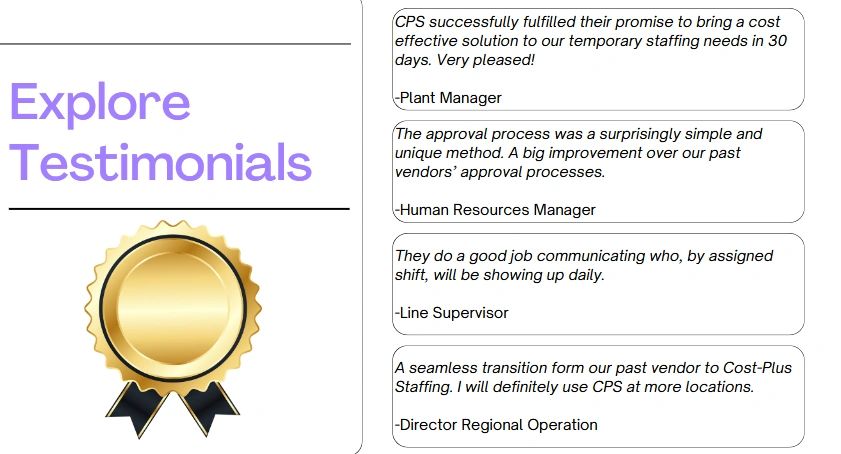 Cost-Plus Staffing is ideal for employers in need of 20 to100 Temporary Workers. Quickly ramp up or down as needed.